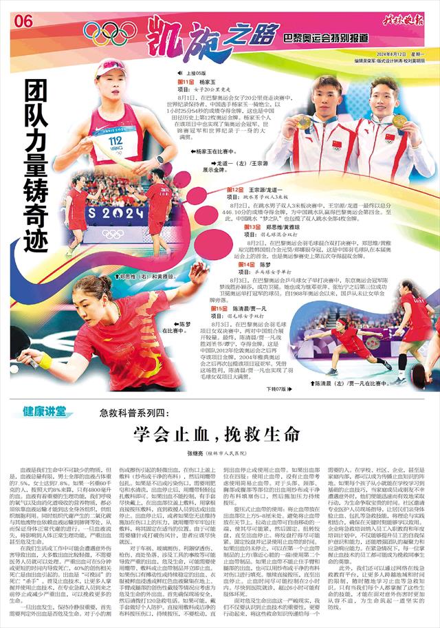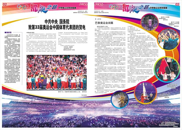 今天,本报推出《凯旋之路——巴黎奥运会特别报道》,和你一起回顾中国体育代表团40个夺金的激情时刻,和你一起重温中国体育代表团展现的中华体育精神和奥林匹克精神,和你一起分享中国奥运健儿结束巴黎征程、即将凯旋的快乐,和你一起祝愿中国奥运健儿2028年洛杉矶奥运会再创辉煌!