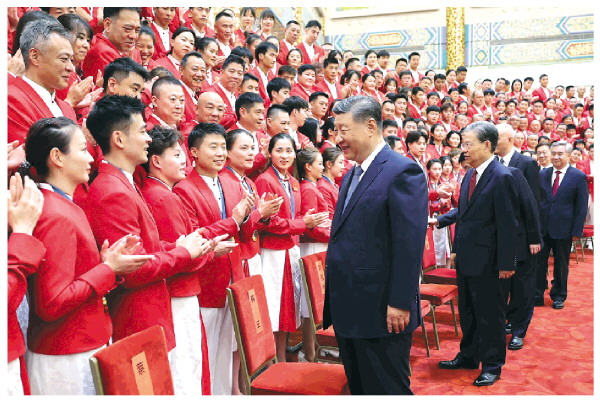 在热烈的掌声中,习近平发表重要讲话。他表示,中国体育代表团的优异成绩,既是我国体育事业发展进步的集中体现,也是中国式现代化建设成就的一个缩影,充分彰显了新时代中国力量。国运兴则体育兴、国家强则体育强。我国能够跻身世界体育大国、奥运强国之列,根本在于综合国力不断增强,为体育竞技训练提供了先进科技支撑和坚实物质保障,也为各领域体育人才脱颖而出创造了良好成长环境和广泛群众基础。新时代新征程,以中国式现代化全面推进强国建设、民族复兴伟业,必将为我国体育事业发展提供更好条件、注入强劲动力。我们要继续大力发展以人民为中心的体育事业,推动全民健身和全民健康深度融合,向着建设体育强国、健康中国的目标不断迈进。