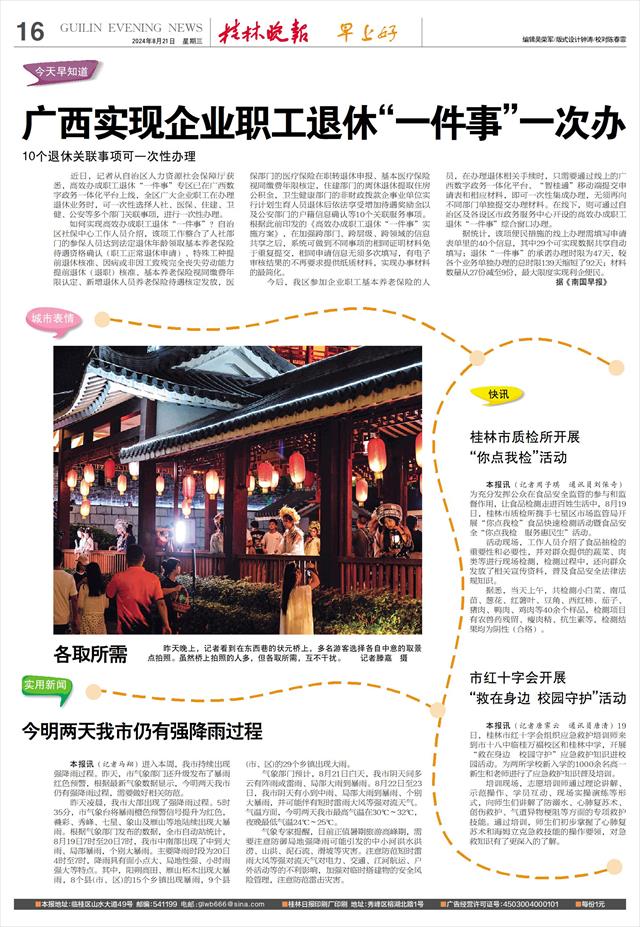 今后,我区参加企业职工基本养老保险的人员,在办理退休相关手续时,只需要通过线上的广西数字政务一体化平台、“智桂通”移动端提交申请表和相应材料,即可一次性集成办理,无须再向不同部门单独提交办理材料。在线下,则可通过自治区及各设区市政务服务中心开设的高效办成职工退休“一件事”综合窗口办理。