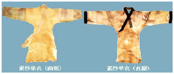 材质和颜色。直裾式素纱单衣以绒圈锦为领、袖缘,曲裾式素纱单衣则以白绢装饰领、袖缘。再加上两件衣服在墓中受浸受染程度不一,曲裾式素纱单衣整体呈现出来的颜色更浅淡,更显飘若无物。