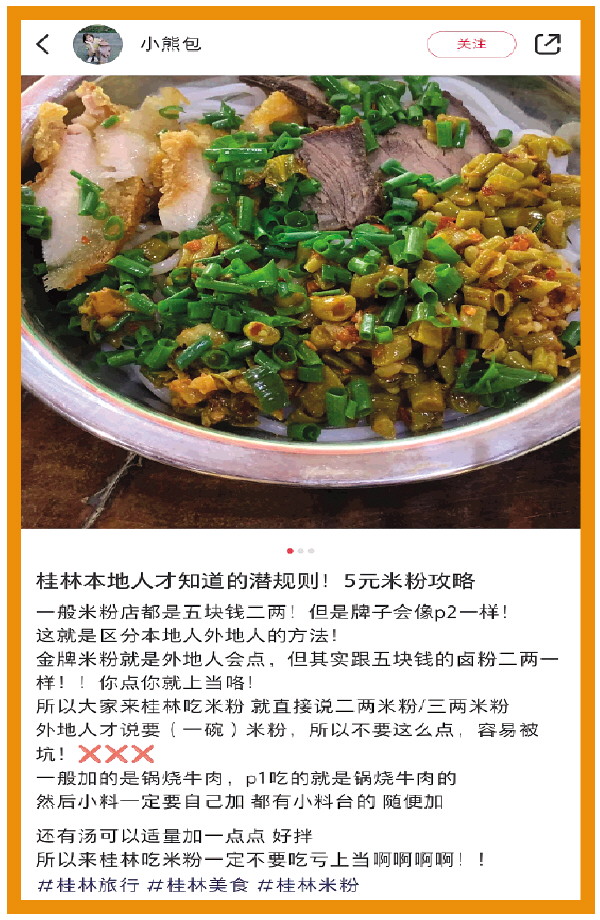 “想要体验本地人的口味,吃5元一碗的米粉就好。这就是桂林人常吃的米粉。”网友“小熊包”不是桂林人,但曾多次到桂林吃粉打卡。她也在小红书上分享了自己的“米粉攻略”。