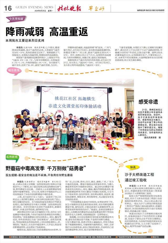 伴随降雨的减弱,高温趁势要“烧”起来。广西气象台预计,8月26日至28日,是本轮高温最强盛时段,将蔓延至整个广西大部,最高气温将达到35℃~37℃。其中,桂林以多云天气为主、局部有阵雨或雷雨,与常年同期相比,雨量正常,温度正常到偏高。