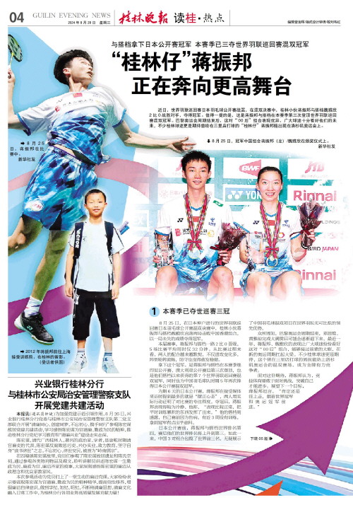 正在奔向更高舞台   近日,世界羽联巡回赛日本羽毛球公开赛战罢,在混双决赛中,桂林小伙蒋振邦与搭档魏雅欣2比0战胜对手,夺得冠军。值得一提的是,这是蒋振邦与搭档在本赛季第三次登顶世界羽联巡回赛混双冠军。巴黎奥运会周期结束后,这对“00后”组合表现优异,广大球迷十分看好他们的未来,不少桂林球迷更是期待曾经在三里店打球的“桂林仔”蒋振邦能出现在洛杉矶奥运会上。