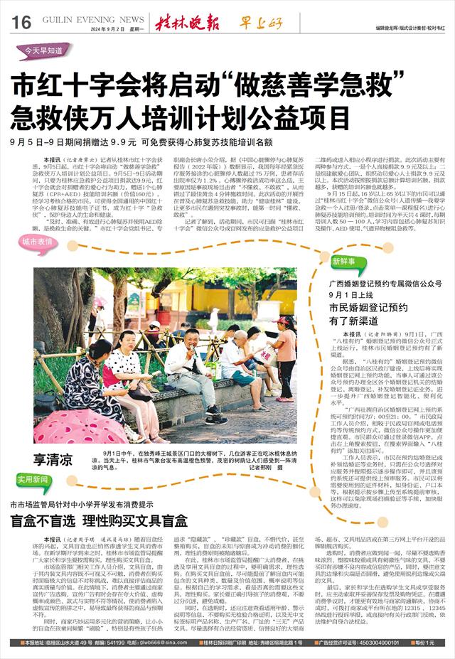 9月15日起,16岁以上65岁以下的市民可以通过“桂林市红十字会”微信公众号(人道传播—我要学急救—个人注册/登录,点击菜单—课程报名)进行心肺复苏技能培训预约。培训时间为半天共4课时,每期培训人数50—100人,学习内容包括心肺复苏知识及操作、AED使用、气道异物梗阻急救等。