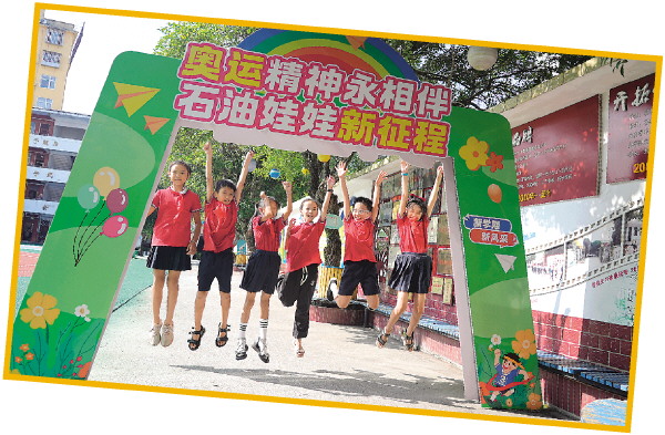8点半,石油小学的学生正在学校新操场参加奥运主题活动,“足球小将”“灌篮高手”“花式跳绳”三个比赛项目前排起了长队。五年级(4)班学生王旌权在同学面前大秀球技,三次射门全部射进,获得阵阵喝彩。“听老师讲,新操场是暑假期间重修的,新铺的塑胶跑道和人工草皮踩上去非常舒服,新学期户外活动和体育课我会更喜欢。”王旌权说。