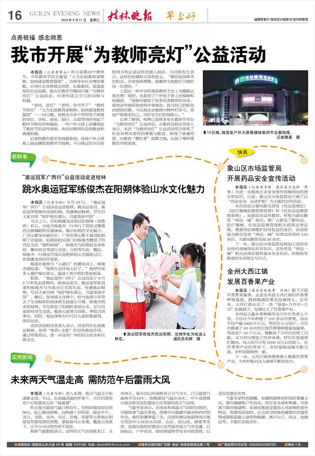 “老师,您好”“老师,您辛苦了”“教师节快乐”“大力弘扬教育家精神,加快建设教育强国”……10日晚,桂林全市多个带有电子屏幕的单位、学校、商场、银行、公园等同时亮起了教师节相关的祝福语,一些户外大屏上还播放起了教师节的宣传视频,表达对教师的崇高敬意和真诚祝福。