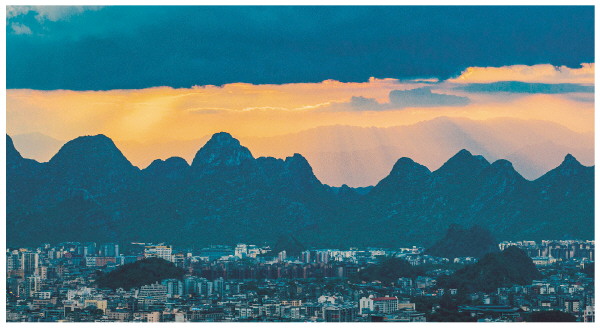 9日傍晚,一场大雨过后,记者通过无人机拍摄到夕阳西下的桂林天空,展现出了一幅壮丽画卷,乌云与落日的余辉交织在一起,勾勒出一幅浓墨重彩的天然油画,美得让人心醉神迷。 记者滕嘉 摄