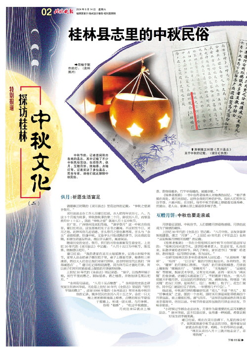 桂林县志里的中秋民俗   中秋节前,记者查阅我市各地的县志,其中记载了不少中秋民俗活动,包括祭月、供月、互赠月饼、烧柚香、点柚灯等。记者采访了多位县志、民俗专家,请他们就此聊聊中秋民俗。