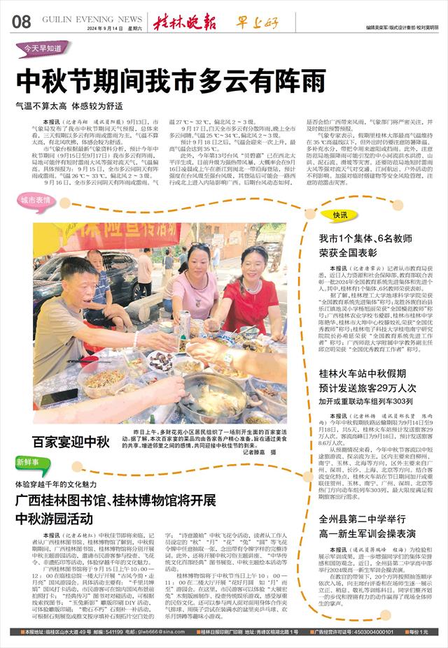 中秋游园活动   本报讯(记者石艳红)中秋佳节即将来临,记者从广西桂林图书馆、桂林博物馆了解到,中秋假期期间,广西桂林图书馆、桂林博物馆将分别开展中秋主题游园活动,邀请市民游客参与投壶、飞花令、非遗拓印等活动,体验穿越千年的文化魅力。