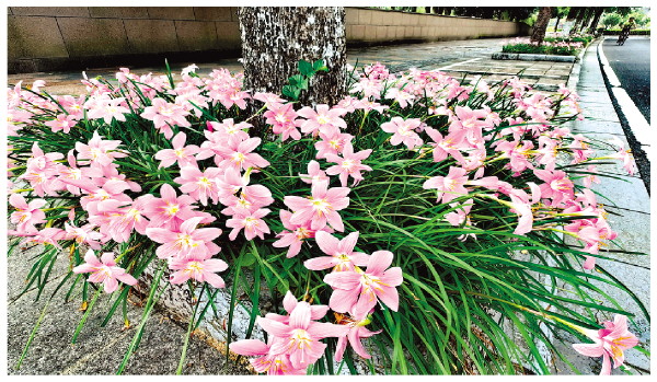 近日,临桂区山水大道两侧行道树树池里的韭兰开满了粉红色的花朵,让道路更充满生机和趣味。微风拂过,粉红色的花朵就像一个个小精灵,不断向经过的路人“问好”。 记者邢刚 摄