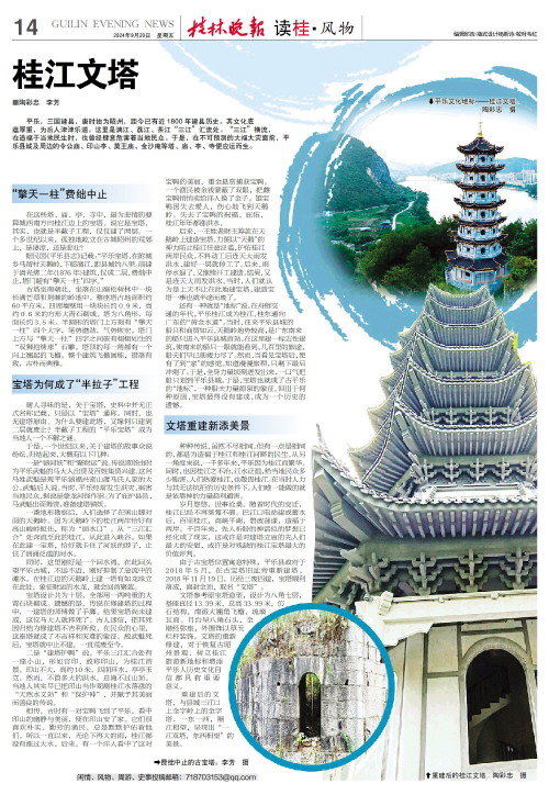 同时,这里刚好是一个回水湾。在此回头望平乐古城,不远不近,刚好抑制了急流中的滩水。在桂江边的天鹅岭上建一塔有如龙珠立在此处,象征财运的水龙,就会回首聚敛。