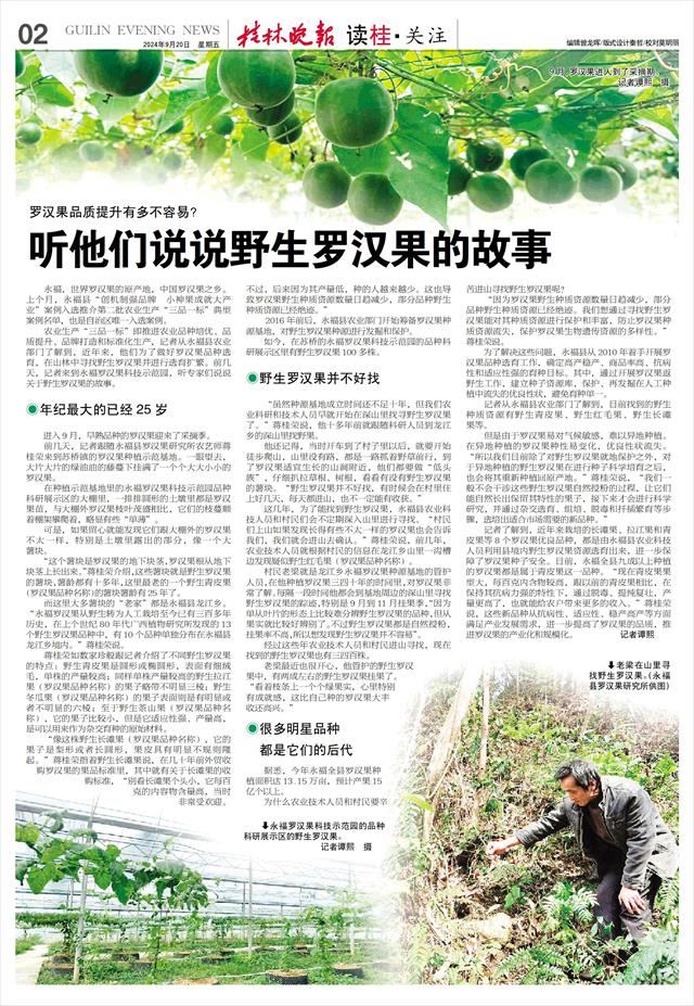 这几年,为了能找到野生罗汉果,永福县农业科技人员和村民们会不定期深入山里进行寻找。“村民们上山如果发现长得有些不太一样的罗汉果也会告诉我们,我们就会进山去确认。”蒋桂荣说,前几年,农业技术人员就根据村民的信息在龙江乡山里一沟槽边发现疑似野生红毛果(罗汉果品种名称)。