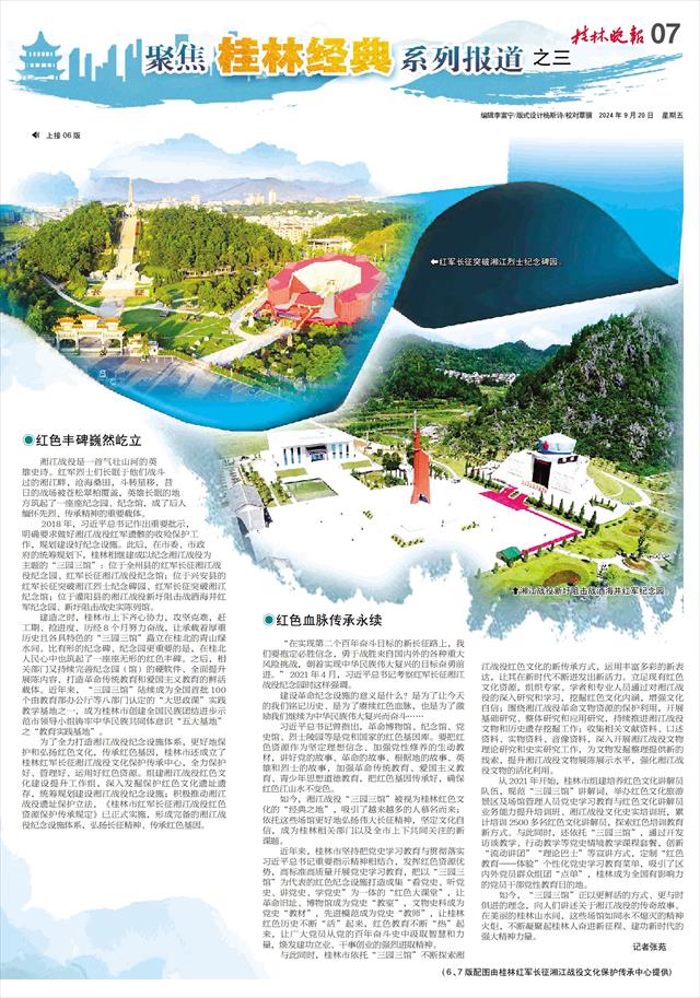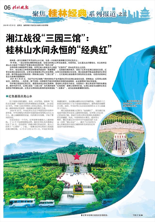 而今,桂北湘江之畔依然回响着激昂奋进的“英雄赞歌”。在英雄长眠的地方,筑起了红军长征湘江战役纪念园、红军长征湘江战役纪念馆、红军长征突破湘江烈士纪念碑园、红军长征突破湘江纪念馆、湘江战役新圩阻击战酒海井红军纪念园、新圩阻击战史实陈列馆(简称湘江战役“三园三馆”)。它们是湘江战役最具代表性的纪念设施,也是讲述桂林红色文化故事的重要载体。