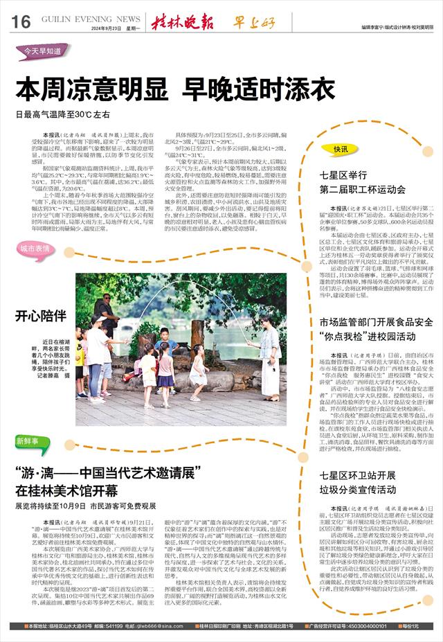 本报讯(记者马翔 通讯员邓智媛)9月21日,“游·漓——中国当代艺术邀请展”在桂林美术馆开幕。展览将持续至10月9日,欢迎广大市民游客和文艺爱好者前往桂林美术馆免费观展。