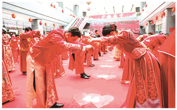 “一拜盛世华年,祝祖国繁荣昌盛;再拜高堂至亲,祝家庭和睦延绵;三拜伉俪同心,祝婚姻幸福美满。”在南宁分会场,56对新人在现场嘉宾和亲朋好友的见证下相携入场,行三敬之礼,许下相守一生的誓言。“95后”新人李佳和陈海燕在去年6月就领了结婚证,但一直没有举行婚礼。“身边的同龄人中不再流行大摆宴席,我们当时也是选择用旅游来纪念。”一些关系好的亲戚主动发来红包,他们也没有收。在陈海燕看来,婚礼最重要的是内在意义,他们更赞成婚事新办简办,祝福和心意到了就好。