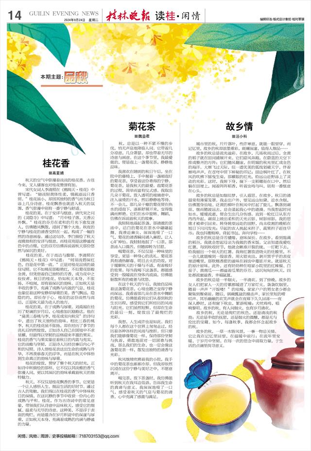 宋代女词人李清照在《鹧鸪天·桂花》中曾写道:“暗淡轻黄体性柔,情疏迹远只香留。”桂花虽小,却因其独特的香气而为秋日添上几分诗意。桂花飘香也就进入秋天的氛围,香气弥漫中别有一番宁静与舒适。