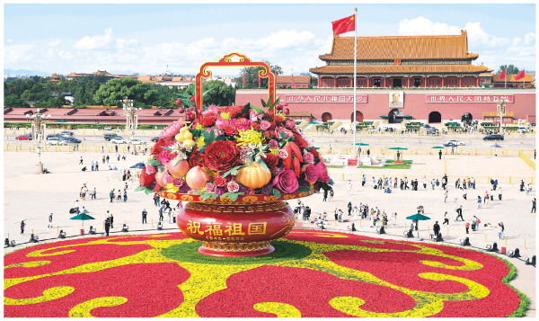 篮体南侧书写“祝福祖国”“1949-2024”字样,篮体北侧书写“普天同庆”“1949-2024”字样。花坛底部直径45米,为如意图案,寓意吉祥如意、国泰民安。新华社发