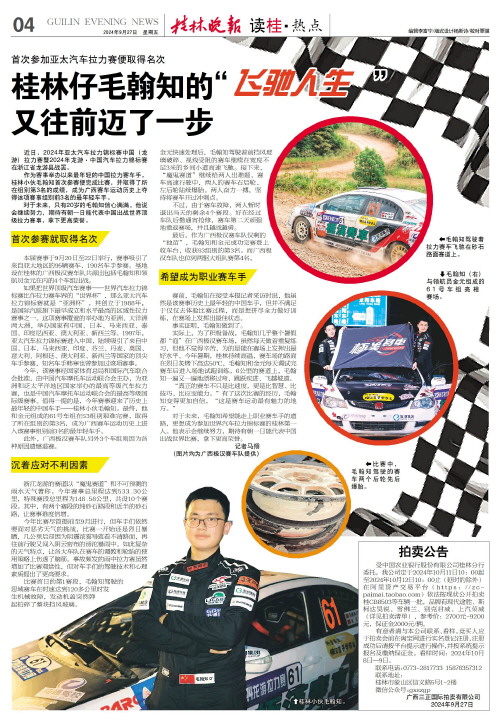 作为赛事举办以来最年轻的中国拉力赛车手,桂林小伙毛翰知首次参赛便完成比赛,并取得了所在组别第3名的成绩,成为广西赛车运动历史上夺得该项赛事组别前3名的最年轻车手。