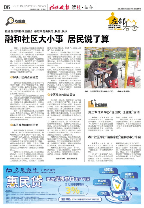 融和社区相关负责人说,以双向融合的方式,社区班子分别对点包联各物业公司,物业公司负责人任五级网格长,积极协调公司提供专业服务人员与社区党员、志愿者建立治安联防、安全生产、应急抢险等党员服务队伍,形成“小社区大党建”的党员服务力量。