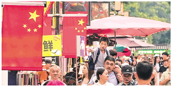 近日在正阳路步行街,一名家长让孩子骑在自己肩膀上,使孩子可以清楚看到四处的街景,孩子想去哪,小手一指,家长就带着他去哪。 记者滕嘉 摄