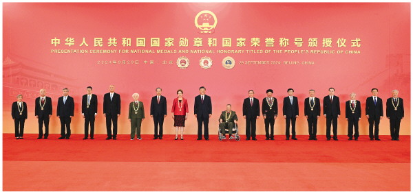 9月29日,中华人民共和国国家勋章和国家荣誉称号颁授仪式在北京人民大会堂金色大厅隆重举行。习近平等领导同志同国家勋章和国家荣誉称号获得者合影留念。