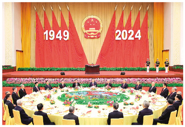 在欢快的乐曲声中,中外宾朋举杯共贺中华人民共和国成立75周年,祝福中国繁荣昌盛、人民幸福安康,中国人民和世界各国人民友谊长存。