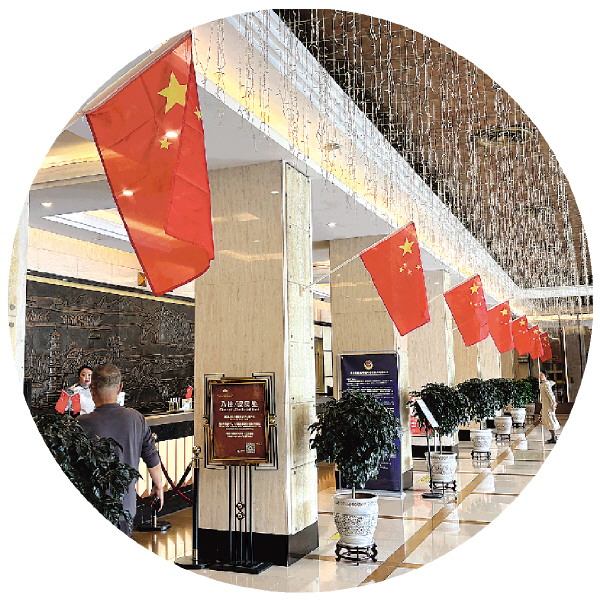 ↑漓江大瀑布饭店大堂处,国庆主题元素满满。