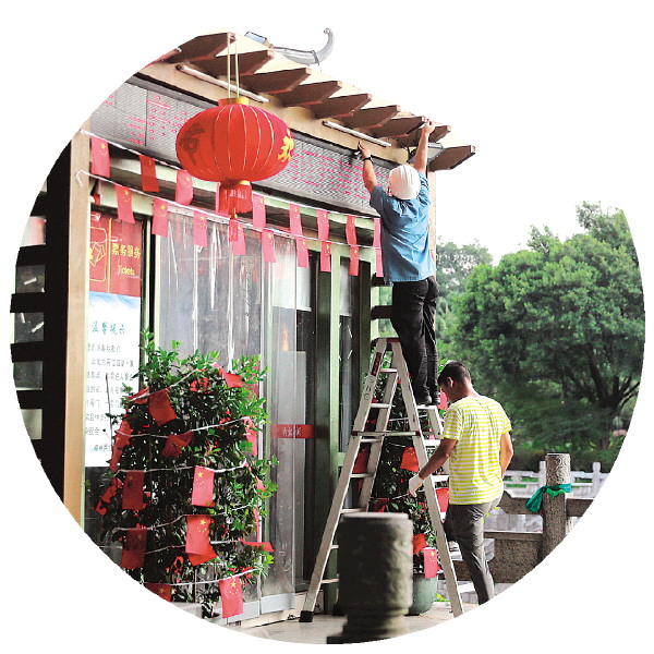 ←工作人员在象山景区外的滨江路上对房屋进行节前检查。