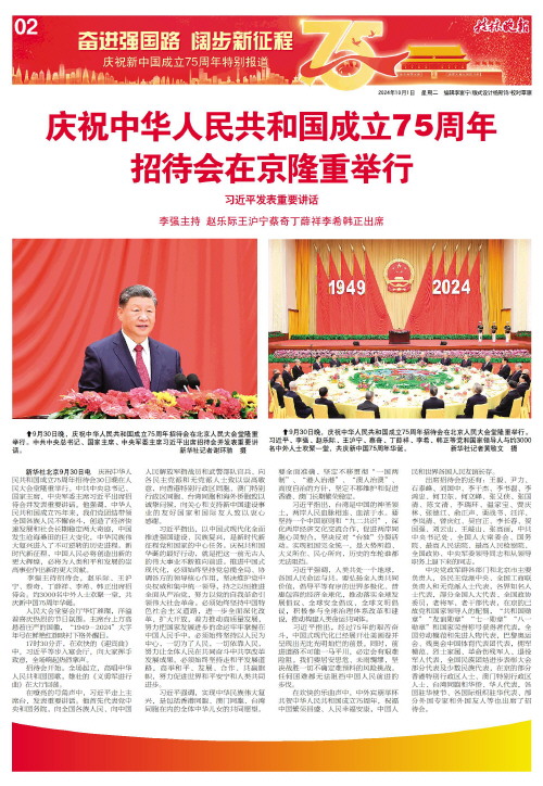 李强主持 赵乐际王沪宁蔡奇丁薛祥李希韩正出席   新华社北京9月30日电 庆祝中华人民共和国成立75周年招待会30日晚在人民大会堂隆重举行。中共中央总书记、国家主席、中央军委主席习近平出席招待会并发表重要讲话。他强调,中华人民共和国成立75年来,我们党团结带领全国各族人民不懈奋斗,创造了经济快速发展和社会长期稳定两大奇迹,中国发生沧海桑田的巨大变化,中华民族伟大复兴进入了不可逆转的历史进程。新时代新征程,中国人民必将创造出新的更大辉煌,必将为人类和平和发展的崇高事业作出新的更大贡献。