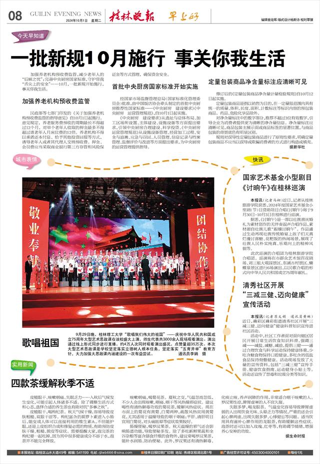 歌唱祖国   9月29日晚,桂林理工大学“歌唱我们伟大的祖国”——庆祝中华人民共和国成立75周年大型艺术思政课在该校盛大上演,师生代表共3000余人现场观看演出。演出通过线上形式同步进行直播,约4万人次同时观看演出盛况,点赞量超35万次。本次大型艺术思政课是学校坚定落实立德树人根本任务,坚定落实“五育并举”教育方针,大力加强大思政课内涵建设的一次有益尝试。      通讯员李娟 摄