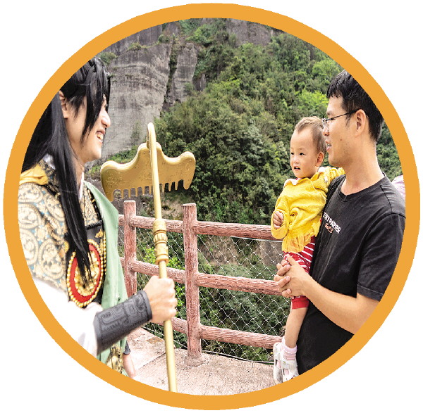 在丹霞八角寨景区,游客开心地与景区工作人员互动。