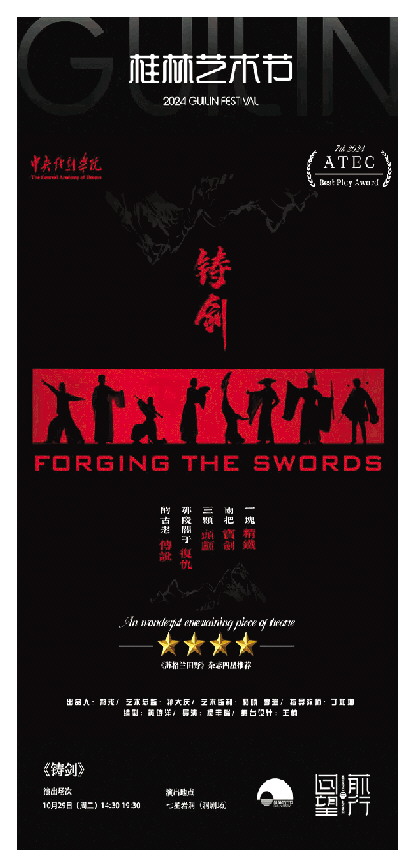 《铸剑》改编自鲁迅先生的同名短篇小说,取材于古代志怪小说“三王墓”的奇幻传说。该剧由中央戏剧学院导演系博士研究生杨丰瑞导演,中央戏剧学院学生主演。在第七届亚洲戏剧院校大学生戏剧展演中,该剧获得唯一“最佳剧目奖”,并赴英国参加2024爱丁堡艺术节fringe单元演出,入选“聚焦中国”项目。