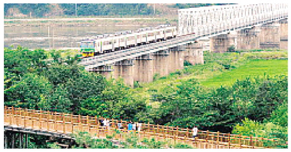 一列火车在跨越朝韩边界的铁路上行驶。(资料图片)