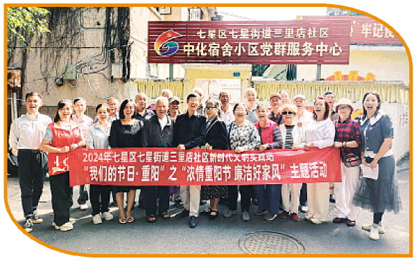叠彩区叠彩街道叠彩社区党委开展的重阳节活动也以健康养生为主题。社区党委联合市公证处、桂林银行芙蓉路社区支行、叠彩社区卫生服务站,共同开展“九九重阳节 浓浓敬老情”社银庆重阳活动。在活动中,叠彩社区卫生服务站的工作人员为老年人提供了免费的医疗卫生服务,包括测量血压、检查口腔,提醒大家注意预防季节流行疾病。市公证处和桂林银行的志愿者开展了普法讲座,普及继承过户、财产分配等公证服务,并解答大家关于银行金融服务方面的疑问,提醒大家在日常生活中注意预防诈骗。叠彩社区党委代表还探望了数位独居老人,给他们送上重阳节慰问礼品。