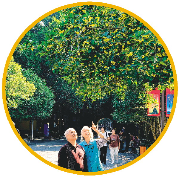 市民在靖江王府片区历史文化旅游休闲街区赏桂花。通讯员李腾钊 摄