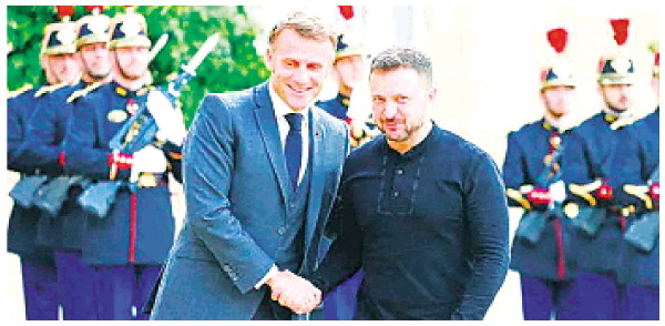 10日,乌克兰总统泽连斯基到达法国巴黎爱丽舍宫后,与法国总统马克龙握手。