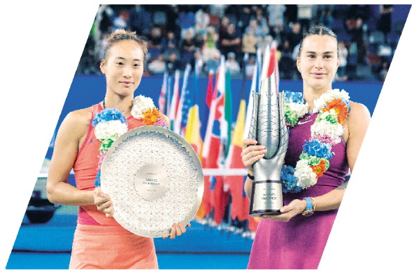↑13日,萨巴伦卡(右)与郑钦文在颁奖仪式上合影。 新华社发