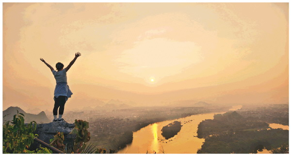 13日在斗鸡山上,一位市民在日出时高举双臂,“拥抱”日出。