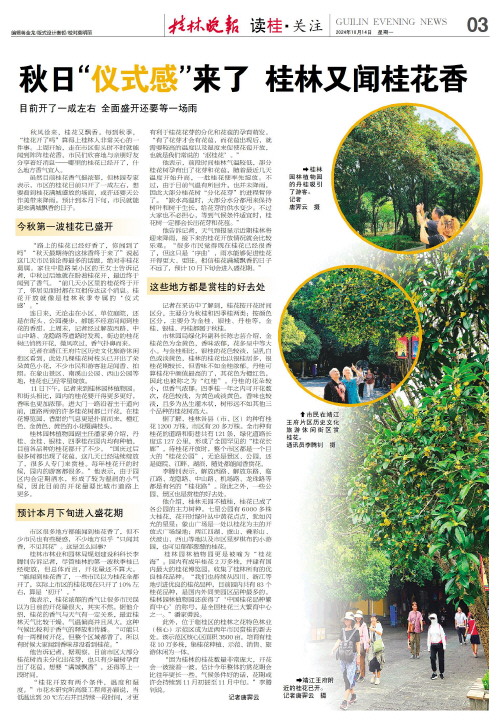 “路上的桂花已经好香了,你闻到了吗”“秋天最期待的这抹香终于来了”说起这几天市民谈论得最多的话题,绝对非桂花莫属。家住中隐路某小区的王女士告诉记者,中秋过后她就在盼着桂花开,最近终于闻到了香气。“前几天小区里的桂花终于开了,邻居见面时都在互相传达这个消息。桂花开放就像是桂林秋季专属的‘仪式感’。”