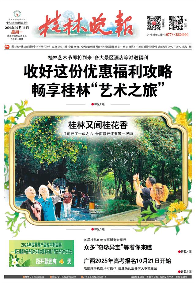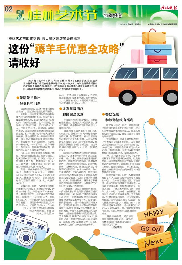 2024桂林艺术节将于10月26日至11月3日在我市举办。目前,艺术节的各项筹备工作正在有条不紊进行中,桂林市文化广电和旅游局根据我市的文旅融合特色内容,推出了一份“薅羊毛优惠全攻略”,共有近百项餐饮、景区、酒店和旅游路线的优惠福利,欢迎广大市民游客前去打卡。