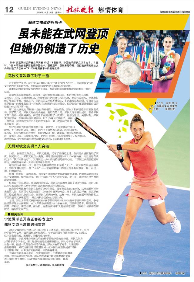 根据公开信息显示,拿到武网亚军后,郑钦文本站赛事获得了650个积分,同时让自己在与美国选手纳瓦罗争夺年终总决赛名额上的优势拉大。