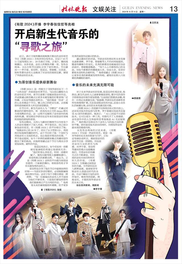 近日,浙江卫视和腾讯视频携手推出的音乐综艺节目《有歌2024》在杭州举办发布会,官宣于10月11日起每周五20:20在浙江卫视、Z视介、腾讯视频播出。众多乐迷、音乐人和媒体齐聚一堂。发布会现场,主办方和节目团队分享了创作理念,节目嘉宾——李宇春、张信哲、张震岳、蔡健雅、汪苏泷、陈粒等著名音乐人也畅谈了对音乐的独到见解,展望了华语音乐的未来。