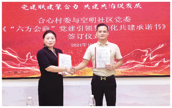 当天的活动中,空明社区党委与七星区朝阳乡合心村委签订了《“六方会商”党建引领契约化共建承诺书》。这是空明社区党委签订的第39家契约化共建单位,而七星区朝阳乡合心村委也是该社区党委签约共建的首个村级党组织。