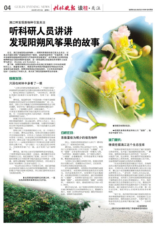 “阳朔风筝果的发现不仅充实了漓江流域的生物多样性,也丰富了我国植物资源宝库。”谭珂说,植物是反映地区生态特性的“风向标”,当地的气候、昆虫种类、降水量等环境因素都会在植物性状上有所体现。即便是很微小的不同,也是帮助研究地域生态特性的宝贵数据。