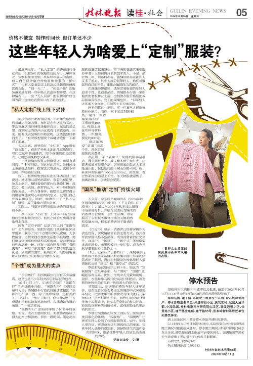 11日,记者从“乐群布行”、西城路步行街和滨江路多家裁缝店和服装定制工作室的经营者处了解到,喜欢定制服装的桂林年轻人最青睐的也是“国风”和“新中式”的款式。