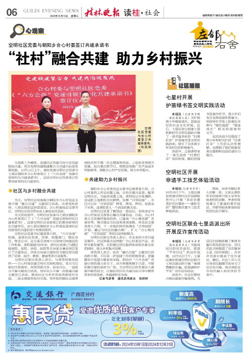 为创新工作载体,加强社区党建与各行业党建联结共建,充分发挥党建联建聚合力共建共治促发展效能,10月14日上午,漓东街道空明社区党委与七星区朝阳乡合心村委签订《“六方会商”党建引领契约化共建承诺书》,这是空明社区党委签订的第39家契约化共建单位。