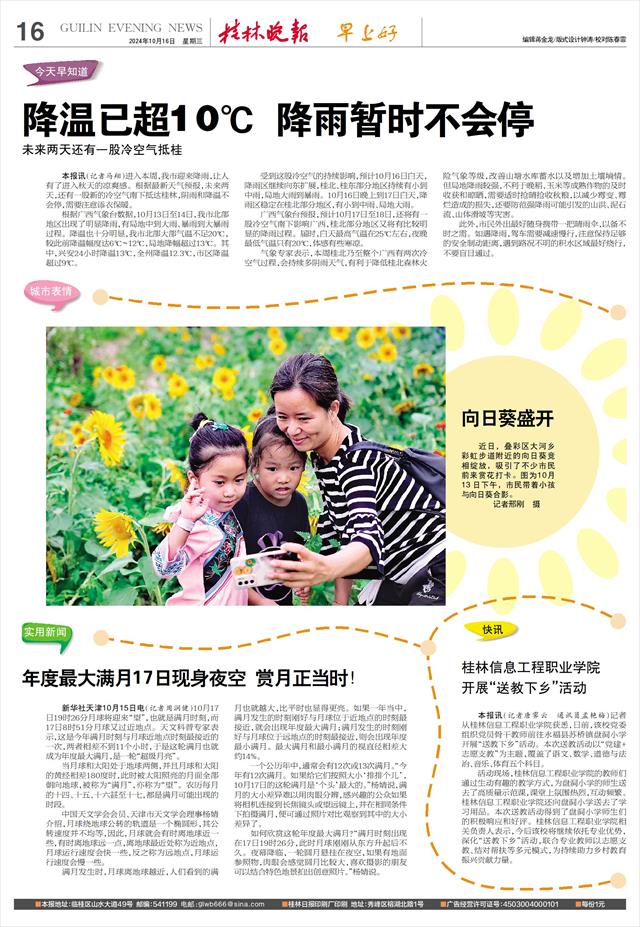 广西气象台预报,预计10月17日至18日,还将有一股冷空气南下影响广西,桂北部分地区又将有比较明显的降雨过程。届时,白天最高气温在25℃左右,夜晚最低气温只有20℃,体感有些寒凉。
