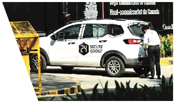 15日,在印度新德里,安全人员在加拿大高级专员公署入口处检查车辆。 新华社/法新