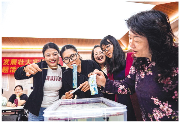 16日上午,秀峰街道解东社区在党群服务中心活动室开展手工漆扇制作活动。解东社区通过打造“艺香公益课堂”,常态化组织群众体验漆扇、团扇、扎染、剪纸等非遗项目,做强做大社区教育工作品牌。 记者滕嘉 摄