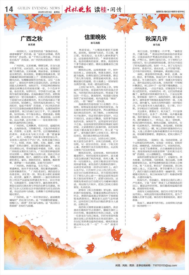广西的秋,是“一年好景君须记,最是橙黄橘绿时”的壮美与生机;是“丰收酣悦甜蜜蜜,独赐行人一路香”的忙碌与喜悦;是“我言秋日胜春朝”的灿烂与浪漫。